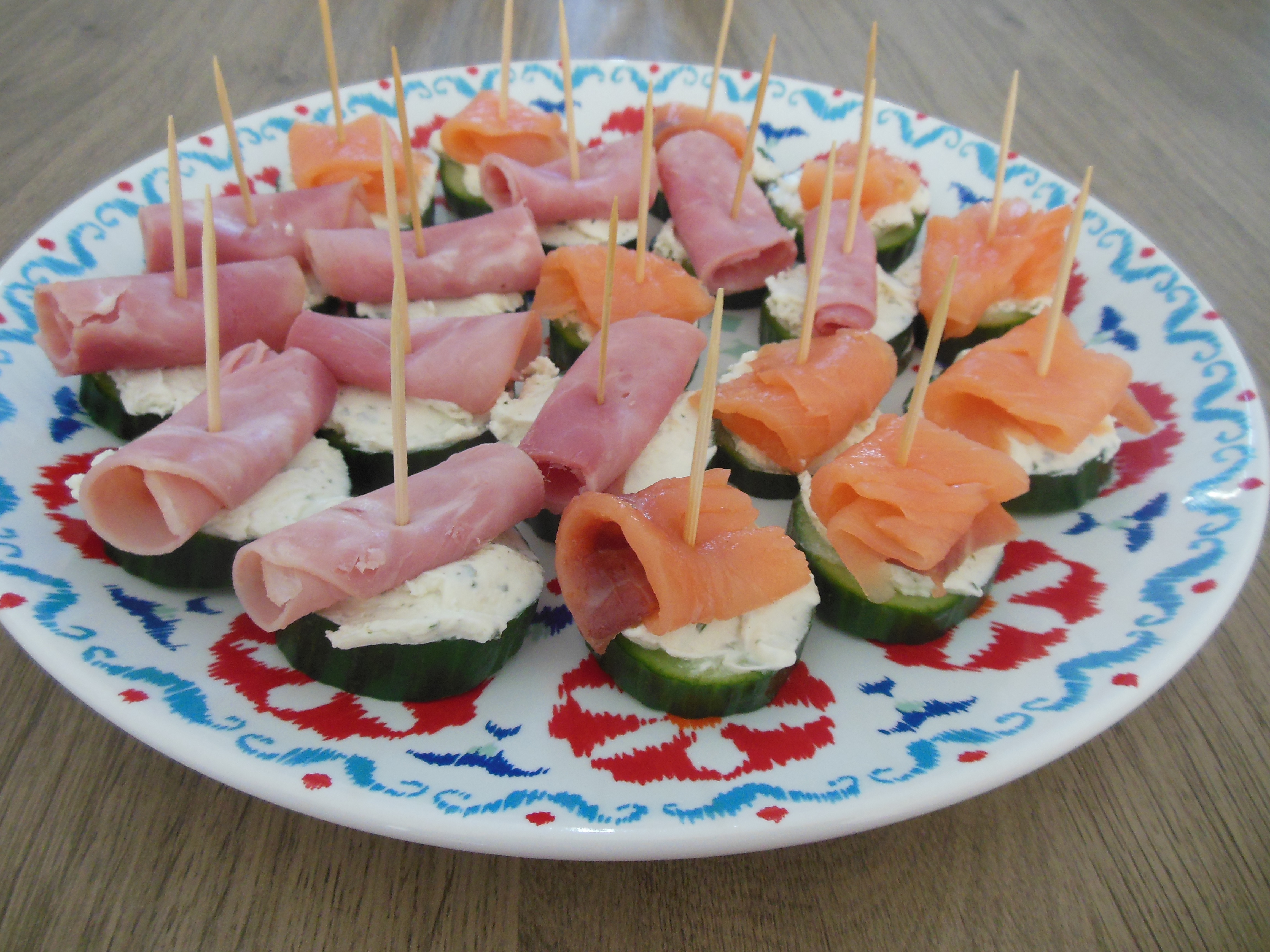 Was de komkommer en snijd hem in plakken. Besmeer ieder plakje met wat kruiden roomkaas. Snijd de zalm in reepjes en rol op. Rol de ham op en snijd de opgerolde plak door de helft. Prik de zalm en/of de ham met een klein prikkertje op de komkommer. Serveer direct of bewaar met plastic folie in de koelkast.