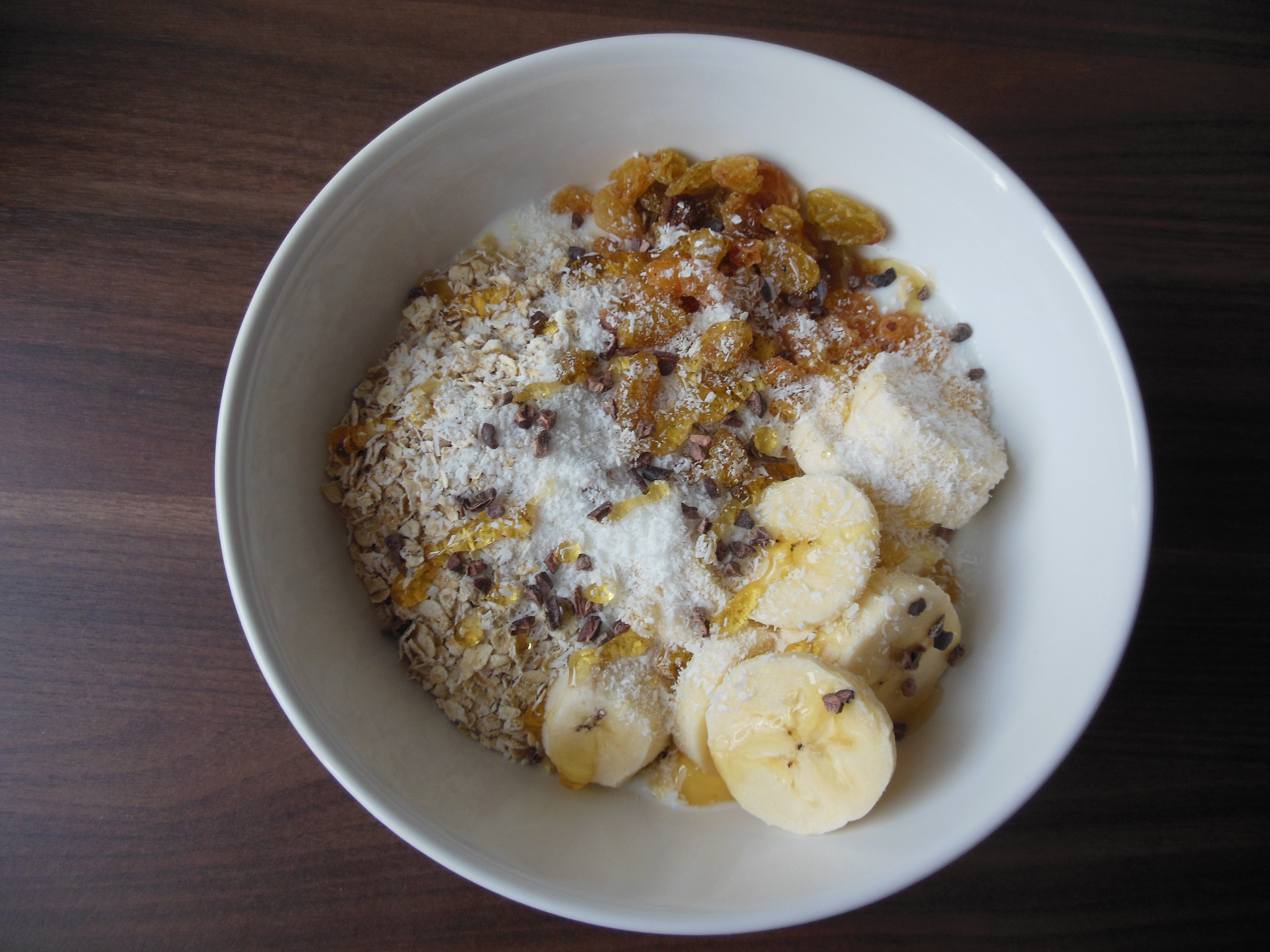 In het weekend is het volgende recept tot nu toe één van de favorieten. Het zorgt er voor dat ik zeker een uur of 2 á 3 vooruit kan zonder trek te krijgen. Ideaal dus als je een drukke dag hebt. Het is lekker snel en gezond. Varieer gerust met verschillende soorten fruit zoals aardbei of kiwi bijvoorbeeld.