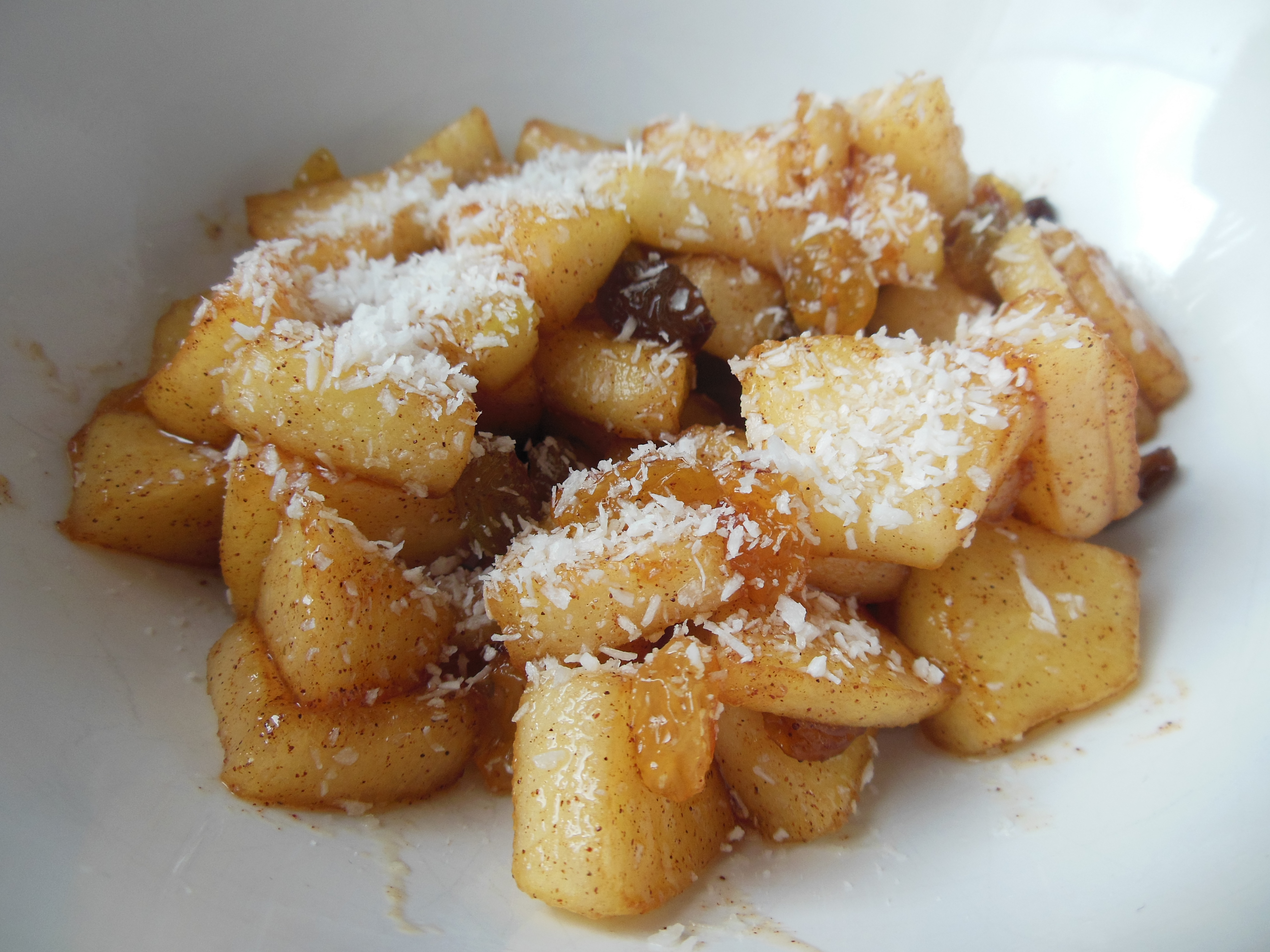 Snijd de appel in stukjes en verwarm ondertussen je pan met het kokosvet of olie. Bak de appel een paar minuten tot ze iets zachter zijn. Voeg de kaneel en de rozijnen toe en bak even mee. Schenk de honing er over en laat een beetje karameliseren. Dit duurt niet zo heel lang, hooguit een minuutje. Zet het vuur uit en de in een schaaltje. Besprenkel met geraspte kokos. Soms doe ik er ook wat cocoa nibs bij voor wat crunch.
