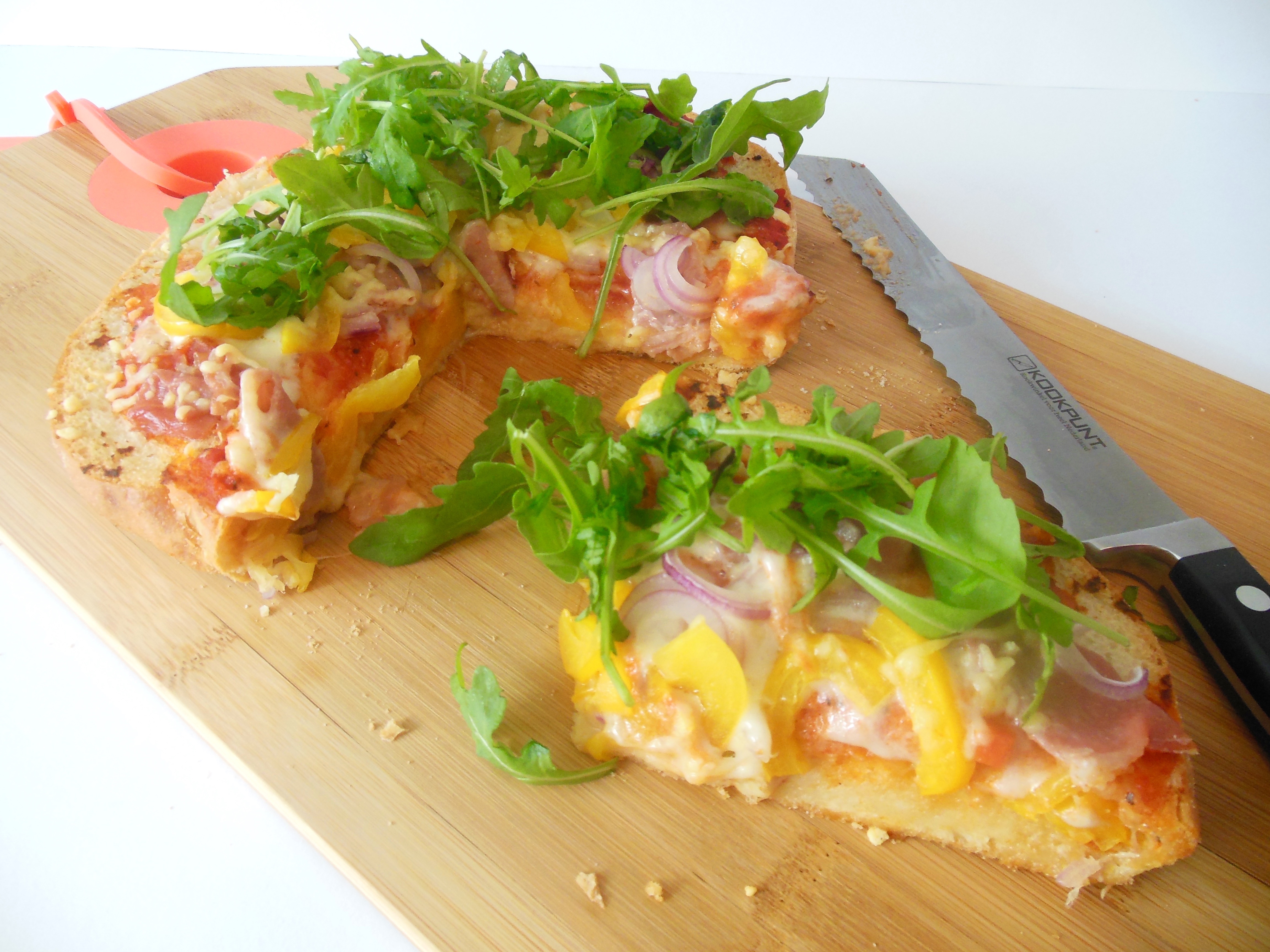 Bestrijk de brood helften met zoveel tomatensaus als je wilt zodra ze uit de oven komen. Beleg met mozzarella, gevolgd door de pancetta. Verdeel de ui en paprika erover en sluit af met wat geraspte kaas. Zet in de oven voor ongeveer 25 tot 30 minuten. Haal uit de oven, snijd hem in vieren en beleg met wat rucola. Serveer met een salade.
