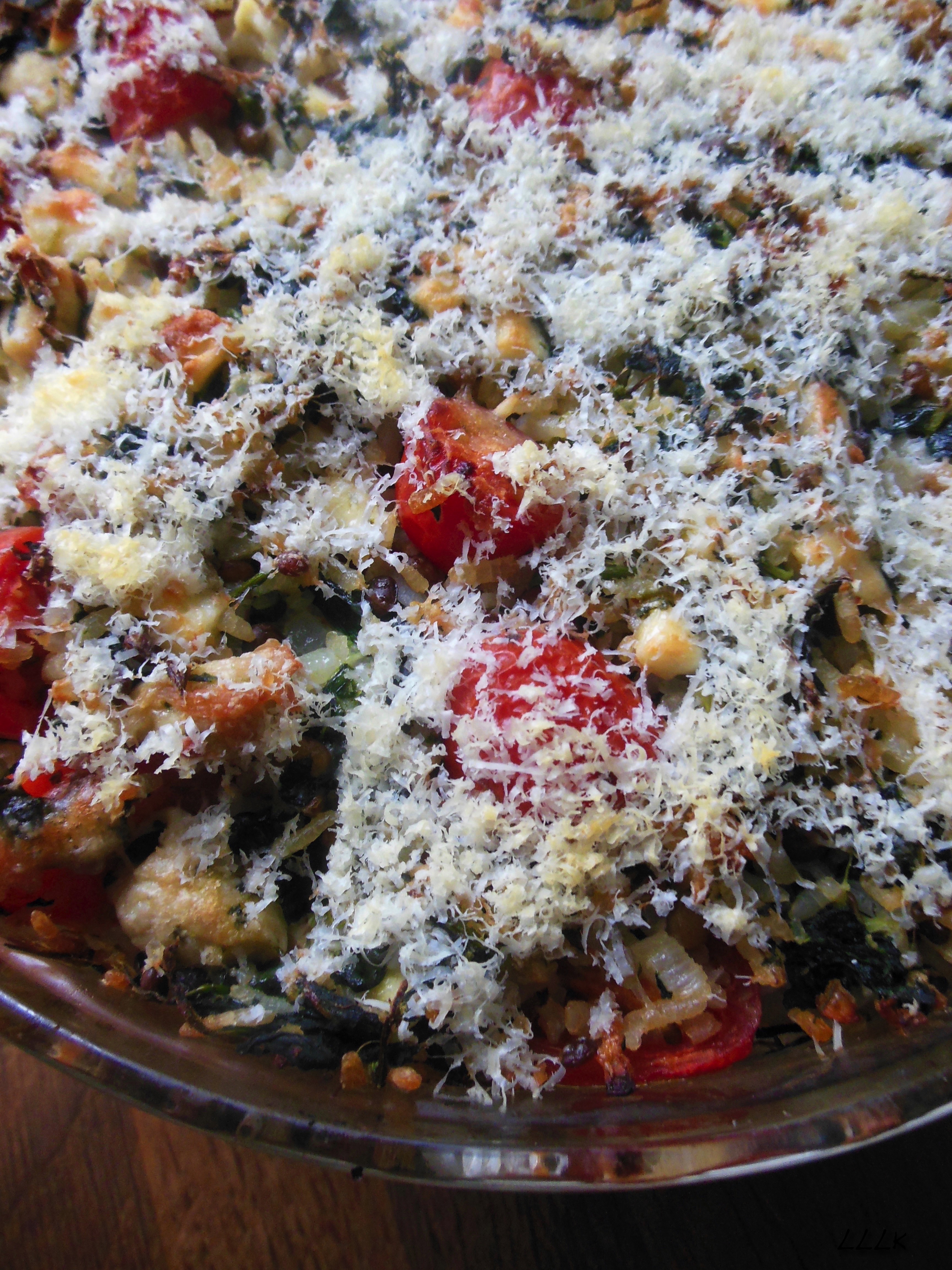 Vet een grote diepe ovenschaal in met wat olie of boter. Doe de helft van het rijst mengsel in de schaal en doe daar de helft van het natte mengsel erbij. Roer tot het enigszins gemengd is en herhaal de twee stappen. Druk alles een beetje aan en verdeel er eventueel wat parmezaanse kaas over. Bak in de oven voor ongeveer 35 tot 40 minuten of tot alles goed heet en goudbruin is.