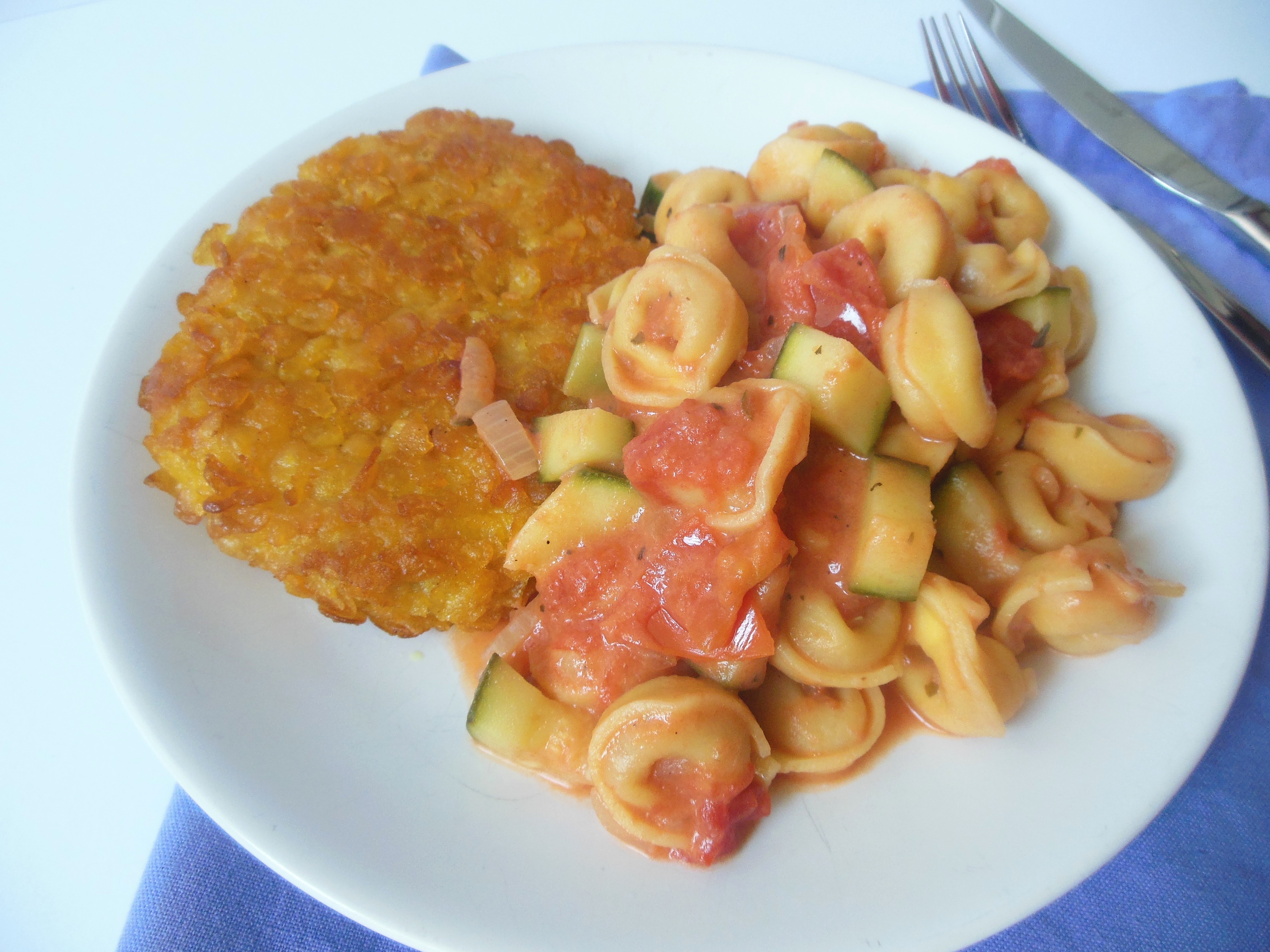 Tortellini met groente saus en kip krokant schnitzel