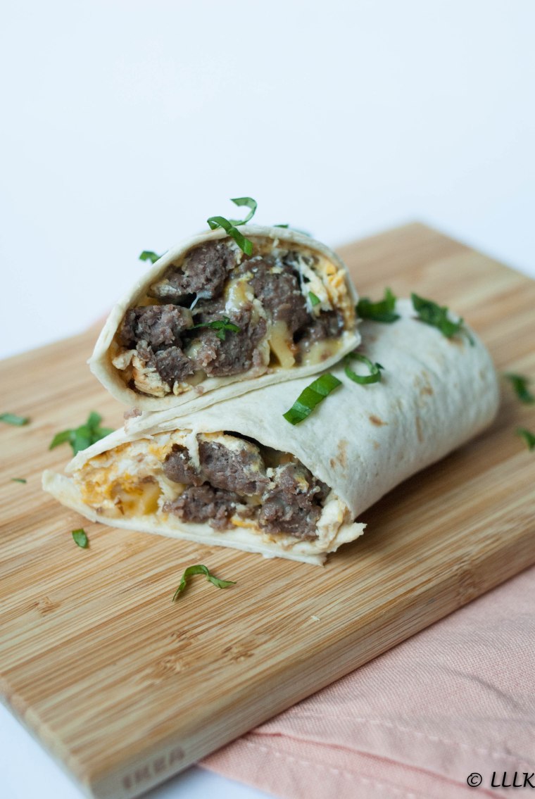 Een paar uur voor ik naar mijn werk moest, kreeg ik ineens een idee. Er zat nog een wrap en wat braadworst in de vriezer die nodig eens op gemaakt moesten worden. Het leek me wel een leuk idee om er een soort ontbijt van te maken. Ondanks dat ik ze later had ingepakt en ze ’s avonds op mijn werk had opgegeten. Ik verkruimelde de worstjes en voegde er wat eieren, kaas en kruiden aan toe. Je zou het kunnen zien als een soort rommelige roer ei in een wrap. Door de kaas en het half geklutste ei word het hele geheel lekker romig. De worst zorgt ervoor dat de maaltijd ook nog lekker vult zodat je er een hele tijd op vooruit kunt. Ik weet dat het niet het meest gezonde ontbijt is, maar zo op zijn tijd moet dat kunnen vind ik.