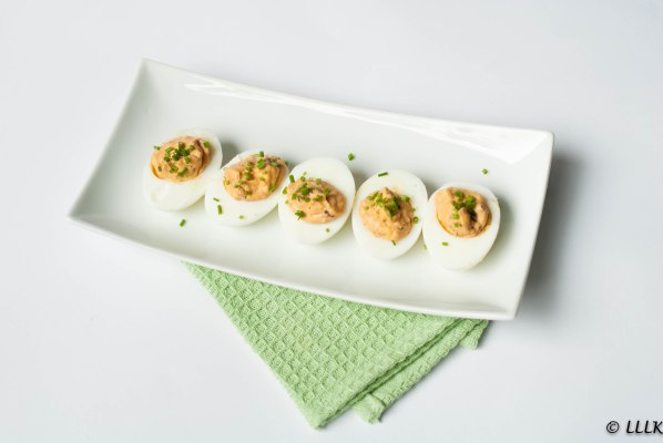 Gevulde eieren met bacon en gerookt paprikapoeder