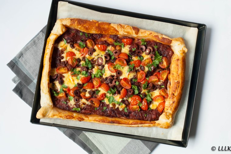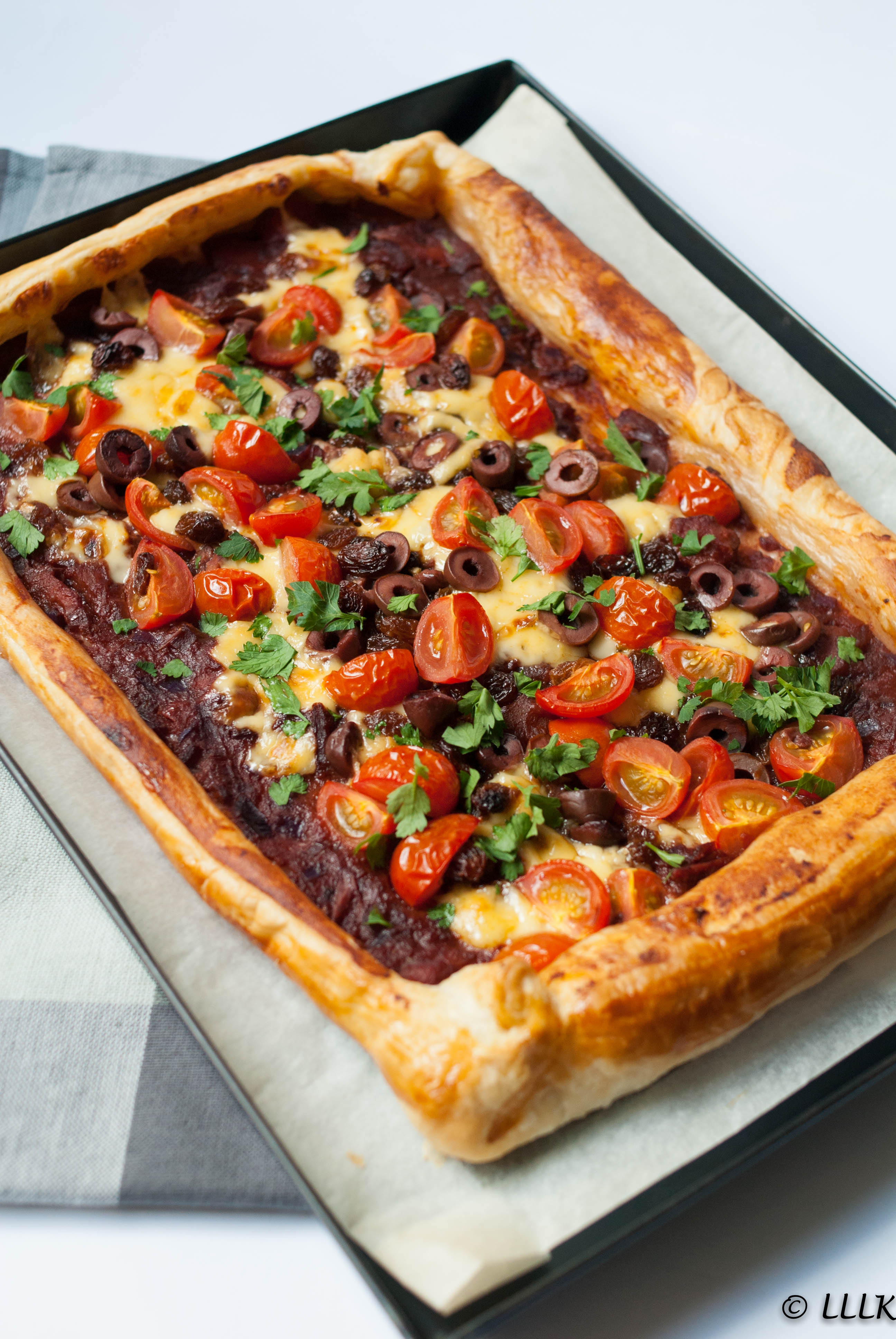 Een hele tijd geleden maakte ik op mijn werk een recept van pasteitjes uit een kookboek. Hoewel ik inmiddels al niet meer weer hoe het precies heette en uit welk boek het was, heb ik de smaak combinatie altijd onthouden. Ik wilde er graag thuis mee aan de slag om er mijn eigen ding van te maken. Het heeft even geduurd, maar uiteindelijk is er een heerlijke plaattaart uit gekomen. Normaal gesproken houd ik niet zo van zoete dingen zoals rozijnen in mijn avondmaaltijden, maar bij dit recept denk ik daar toch echt anders over. Zeker in combinatie met de olijven en de kaas. Aangezien ik deze helemaal voor mij alleen had gemaakt, had ik de volgende dag meteen nog een heerlijke lunch.