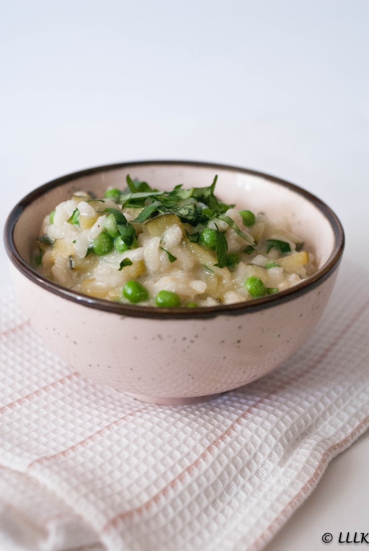 Het was zondag en ik had ineens enorme trek ik risotto. Aangezien ik nog wat restjes in de kast had staan, leek het me wel een handig idee om die in mijn risotto te stoppen. Uiteindelijk vond ik de combinatie zo lekker dat ik het gelijk maar heb opgeschreven en op de foto heb gezet. De combinatie van courgette, doperwten en limoen/citroenrasp maken hem uitermate geschikt voor de lente. Je kunt er voor kiezen om hem vegetarisch te houden en hem zo te eten, maar je zou er ook een lekker stukje vis bij kunnen bakken.